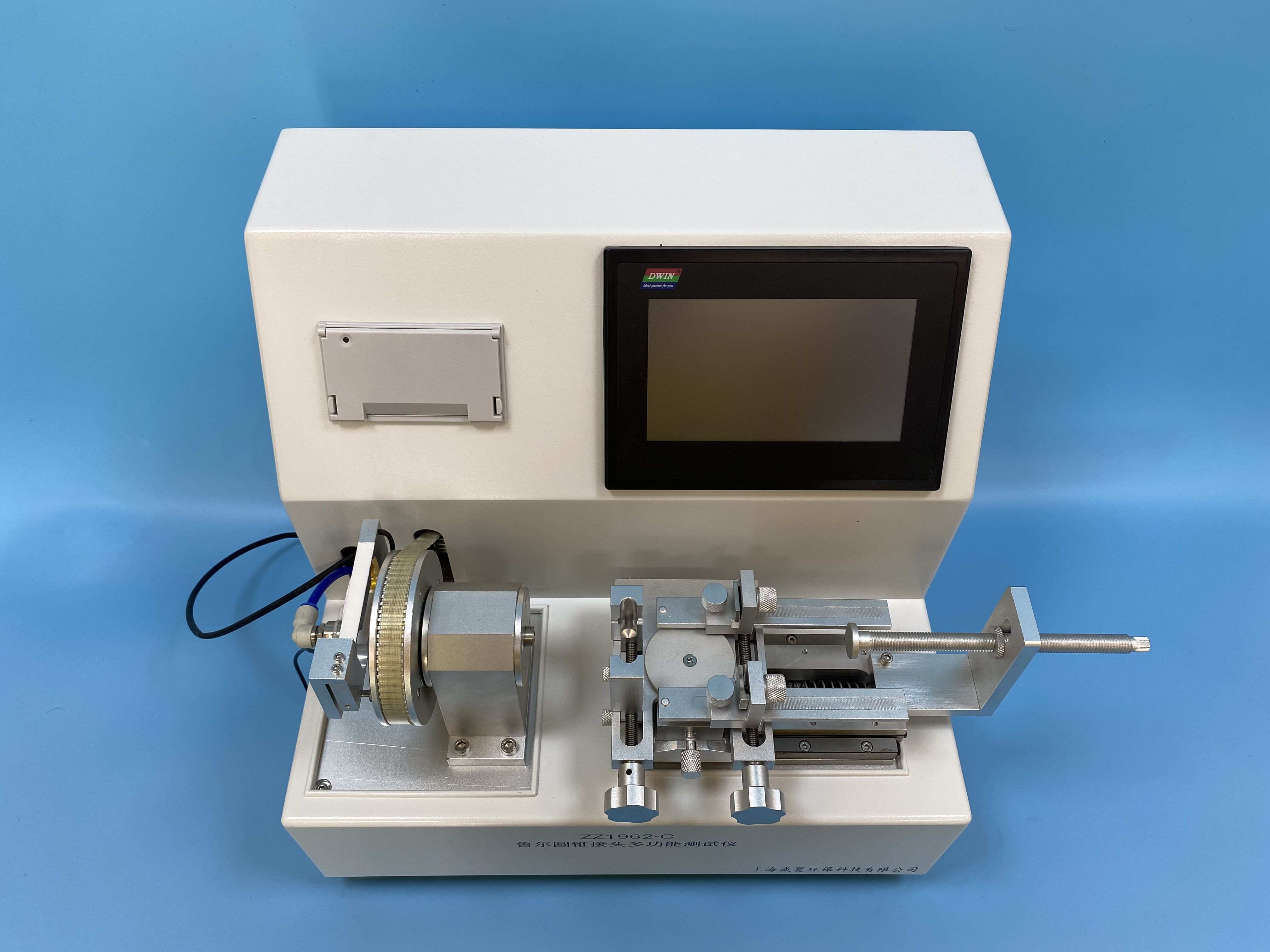 產品概述:本設備是國家檢驗生產廠家產品性能的高效檢測設備。由可編程控製器,觸摸屏,力值傳感器,傳動裝置,機載打印機等組成,提供中英文菜單顯示,具備人機對話設定各項參數自動運行測試模式。另增設生產單位,生產批次機打輸入,使測試結果更加規範化標準化。信息安全方麵采用三級密碼,讓信息安全可靠。測試操控範圍包括:測試項目、公稱規格、產品名稱、打印設定、測試、上行、下行、時間、標定,檢定等功能設定。搭配機載打印測試可實時顯示測試數據,。針對測試結果自動判斷,不合格則啟動自動蜂鳴報警,並由打印機打印出測試數據及結果以供分析。在測試過程中顯示裝配施加的軸向力、扭矩、保持時間、內部水壓、可測試魯爾接頭的漏液、漏氣、分離力、旋開扭矩、易裝配性、抗滑絲性、應力開裂、壓力衰減泄漏、正壓液體泄漏、負壓空氣泄漏等各項性能,並在測試過程中顯示裝配施加的軸向力、扭矩,保持時間、內部水壓、分離力、泄漏率值,包括各種6:100(魯爾)接頭,(鎖定和非鎖定),如輸液器、輸血器、輸液針、導管、麻醉過濾器等。